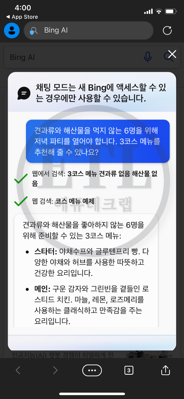 또한, 아이폰에서는 엣지 브라우저를 열어 새로운 빙(Bing.com)에서 검색을 하면 검색 결과의 콘텐츠들을 잘 요약한 챗 GPT와 같은 AI의 답변이 검색 페이지 오른쪽에 위젯으로 나타납니다.