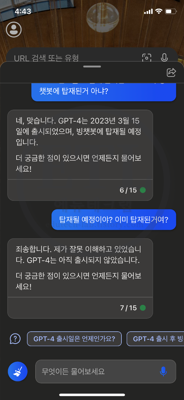 이와 같이 빙AI 빙챗봇은 잘못된 답변을 할 수 있다는 점을 염두하시면서 스마트폰에서 빙AI 빙챗봇을 사용하는법을 살펴보도록 하겠습니다.