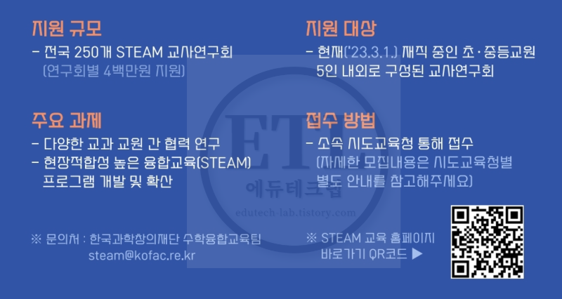 한국과학창의재단에서 운영한 STEAM 교육 홈페이지에서 2023년 STEAM 교사연구회 모집 공고가 나왔습니다.