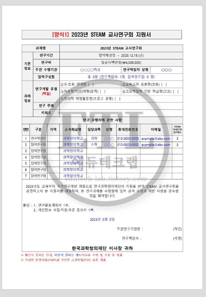 오늘은 교육부와 한국과학창의재단이 운영하는 2023 STEAM 교사연구회 지원서 및 연구활동계획서에 대해서 상세히 살펴보도록 하겠습니다.