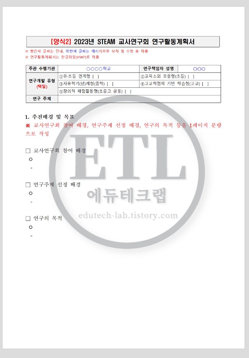 | [양식2] 2023년 STEAM 교사연구회 연구활동계획서 |
