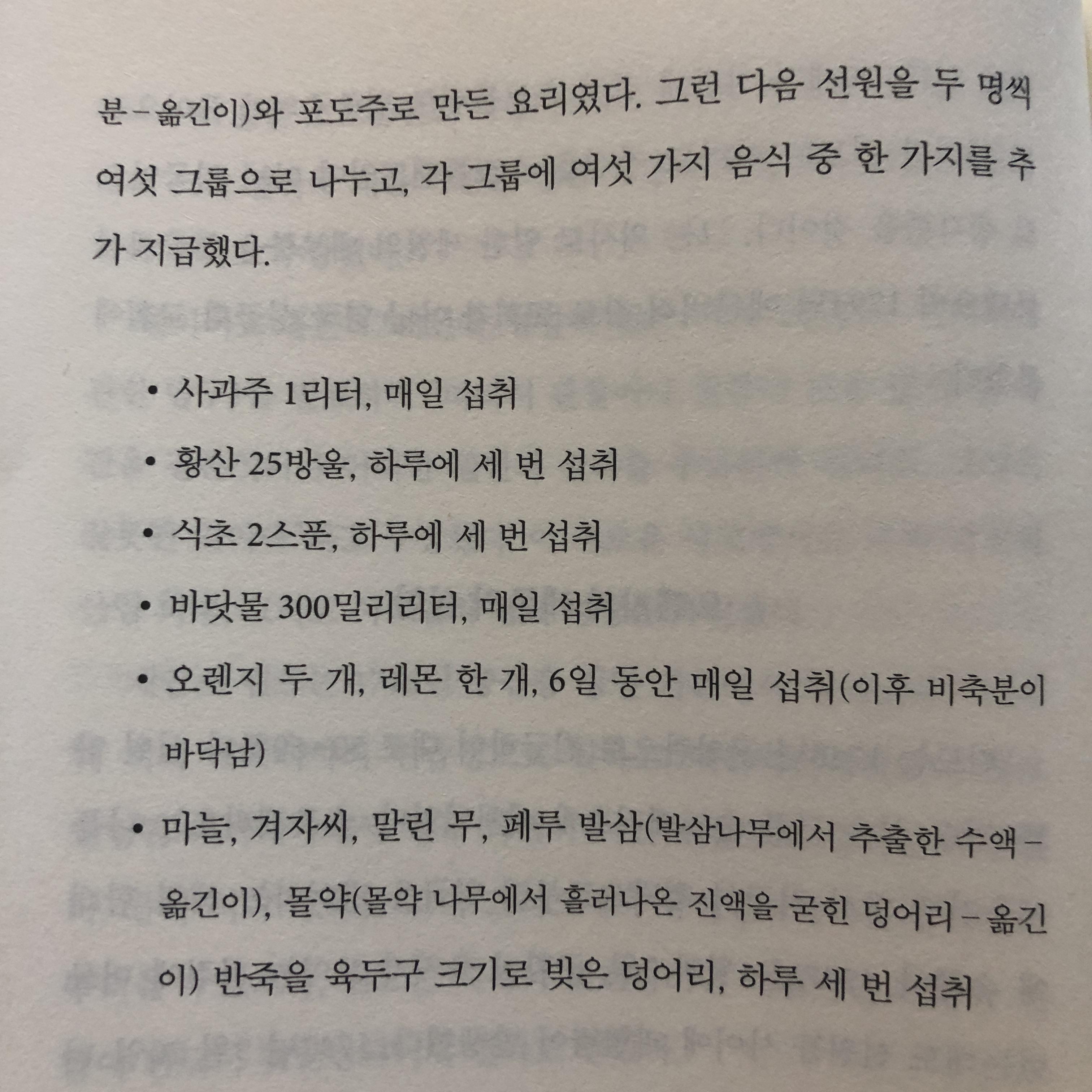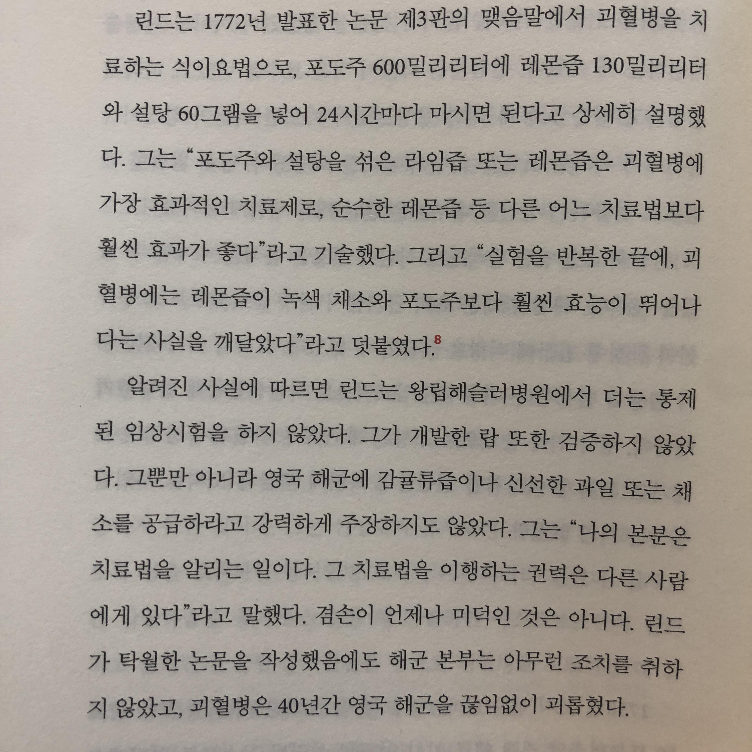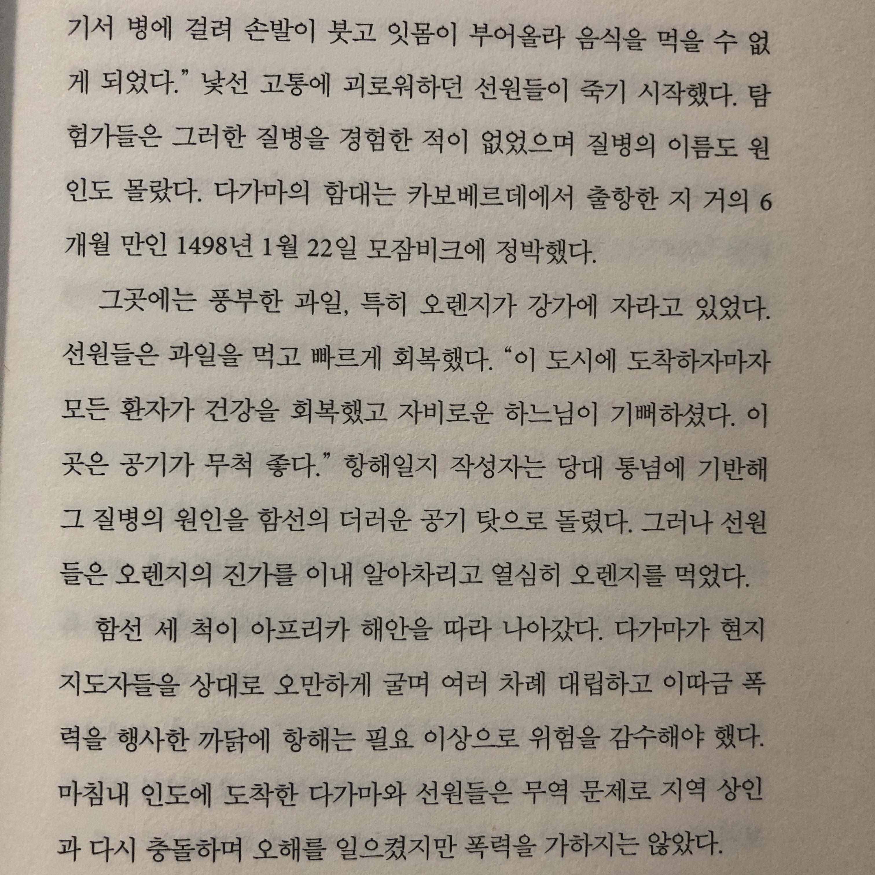 이는 저에게 코에이 명작 고전게임 "대항해시대2"라는 게임에서 경험했던 장기항해 중에 선원들이 괴혈병에 걸리고, 라임주스를 통해 그 병을 치료하는 경험과 매우 유사하게 느껴졌습니다. 이런 연결점이 저에게 이 책을 더욱 생생하고 인상 깊게 만들어주었습니다.