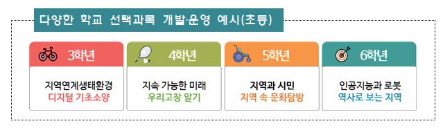ㅇ 학교 자율시간을 도입하여 다양한 지역 연계 교육과정 운영이 가능하도록 선택과목 개발‧운영, 교사의 교육과정 운영 자율권을 확대하고,