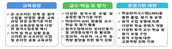 ㅇ 원격수업 등 교실 수업 개방성 증대와 디지털 기반(인프라)을 활용한 다양한 교육방식의 현장 안착을 위해 교육과정 개선과 지원을 강화한다.