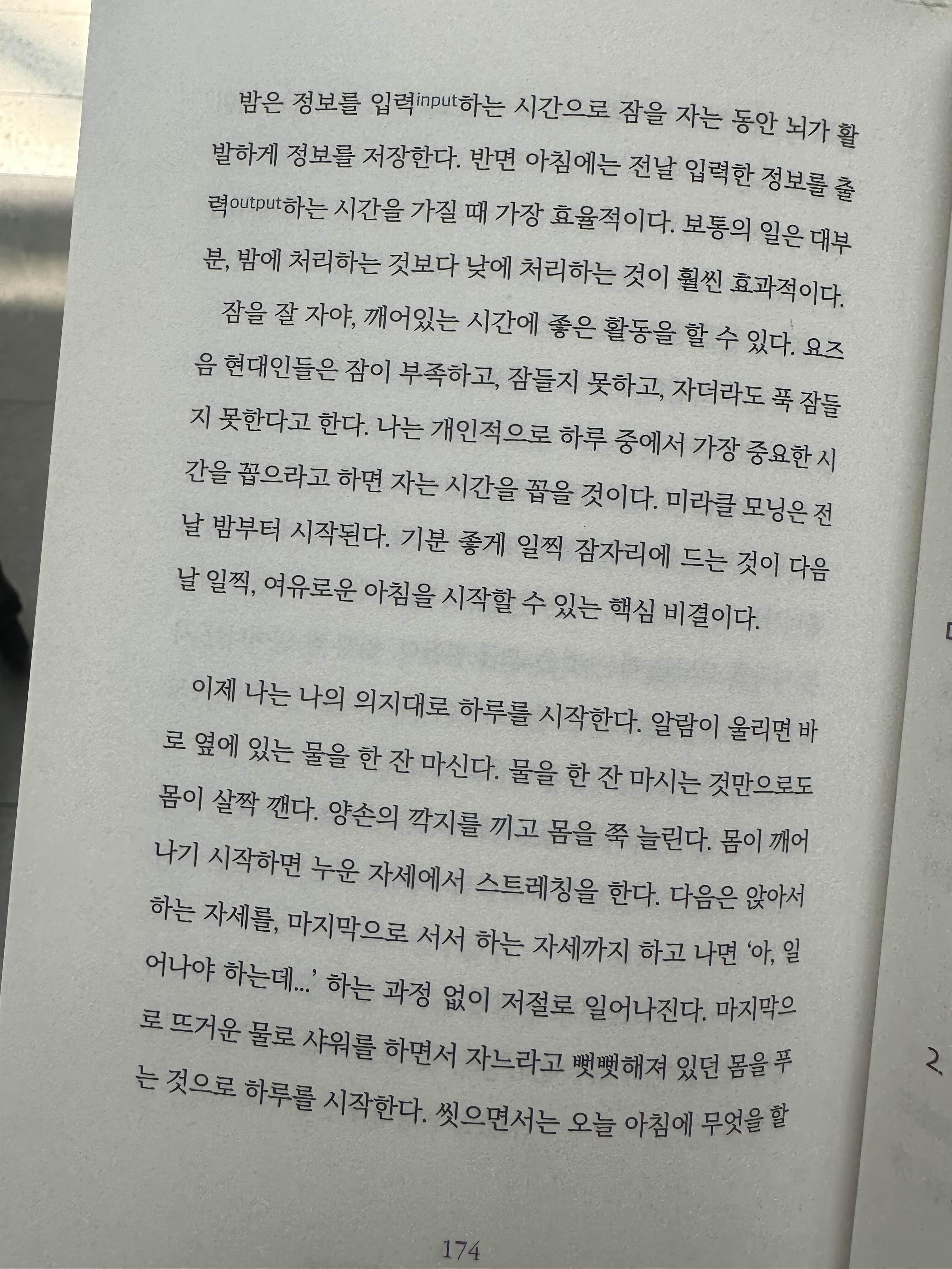 이 부분에서는 효과적인 하루 시작 방법과 잠의 중요성에 대해 말하고 있는데 매우 큰 공감을 느꼈습니다.
