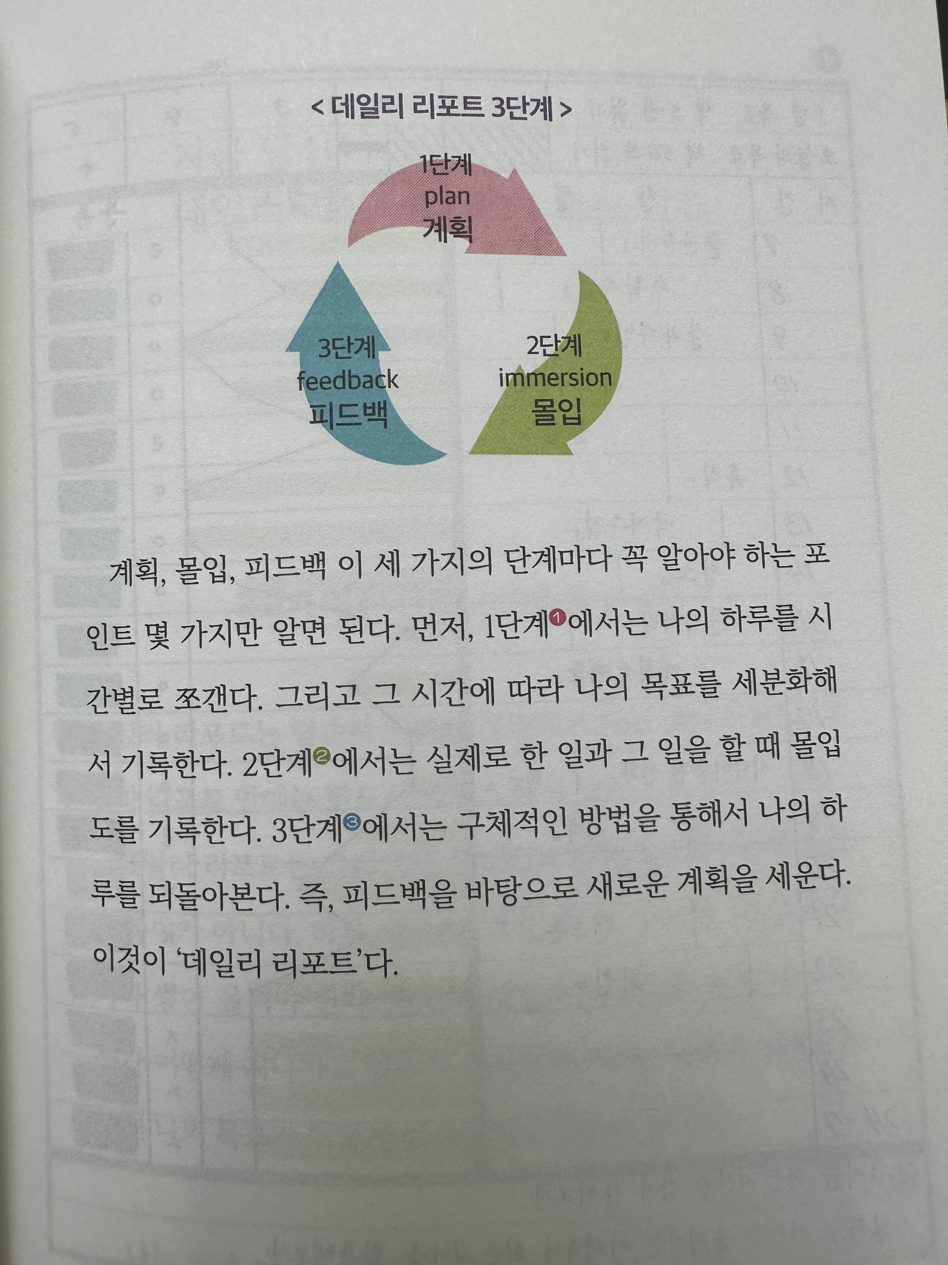 또한, 3단계에서 피드백을 통해 새로운 계획을 세우는 것은 지속적인 성장을 가능케 하는 매우 중요한 과정임을 깨달았습니다. 이 모든 과정이 서로 연결되어 '데일리 리포트'라는 매우 효과적인 시간 관리 도구를 만들어냈다는 것이 인상 깊었습니다.