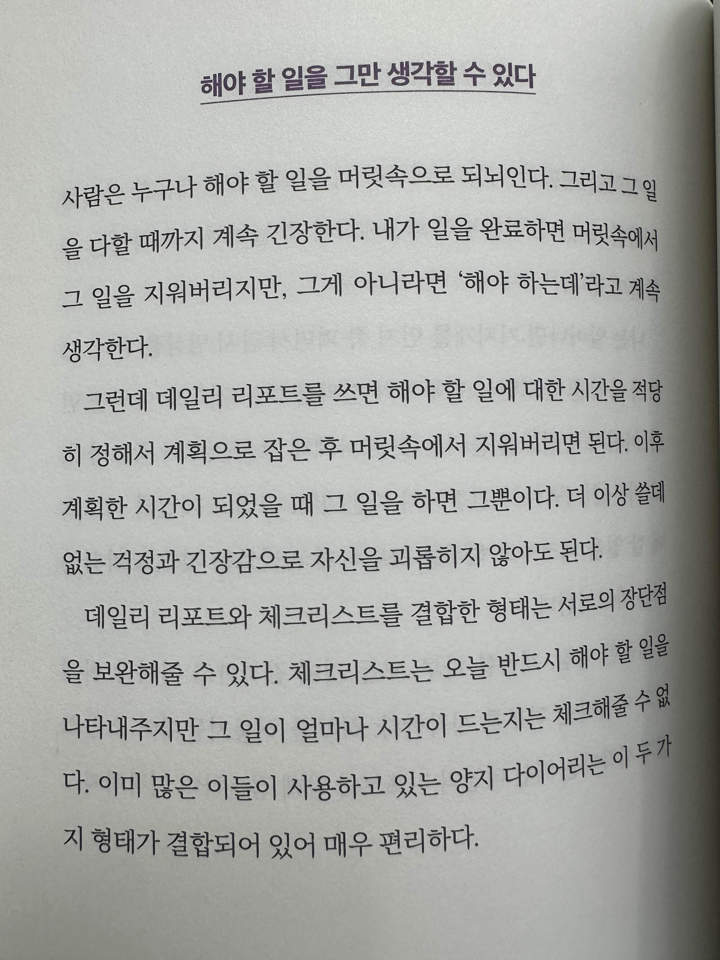 그런데 데일리 리포트를 쓰면 해야 할 일에 대한 시간을 적당히 정해서 계획으로 잡은 후 머릿속에서 지워버리면 된다. 이후 계획한 시간이 되었을 때 그 일을 하면 그뿐이다. 더 이상 쓸데 없는 걱정과 긴장감으로 자신을 괴롭히지 않아도 된다.