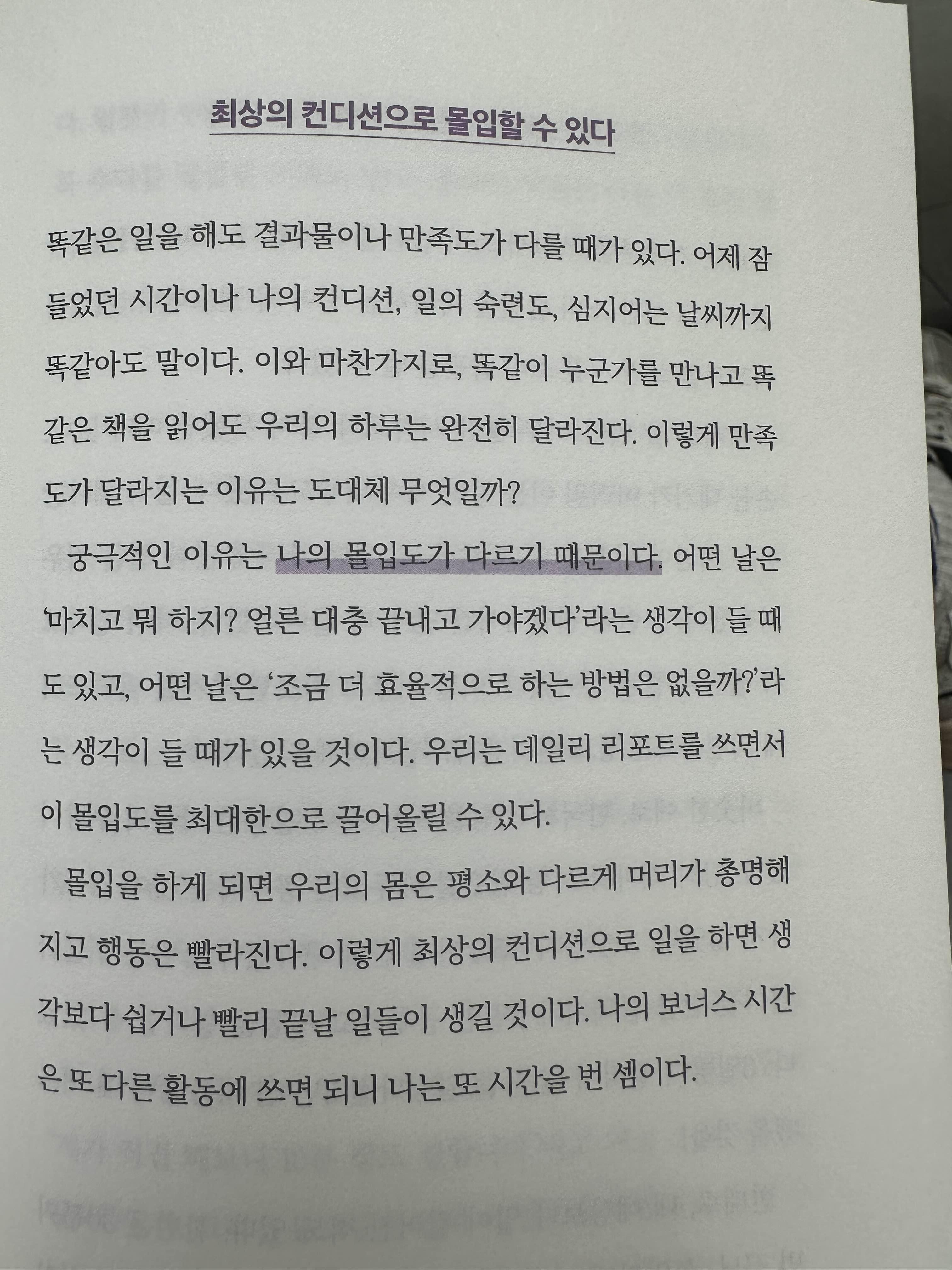 이 부분은 '몰입'의 중요성과 그 효과에 대해 강조하고 있어서 인상적입니다. 일을 하는 데 있어서는 어떤 날은 '대충 끝내고 가야겠다'는 생각이 들기도 하고, 어떤 날은 '효율적으로 하는 방법은 없을까?'라는 생각이 들기도 한다는 것은 많은 사람들이 공감할 수 있는 내용일 것입니다.