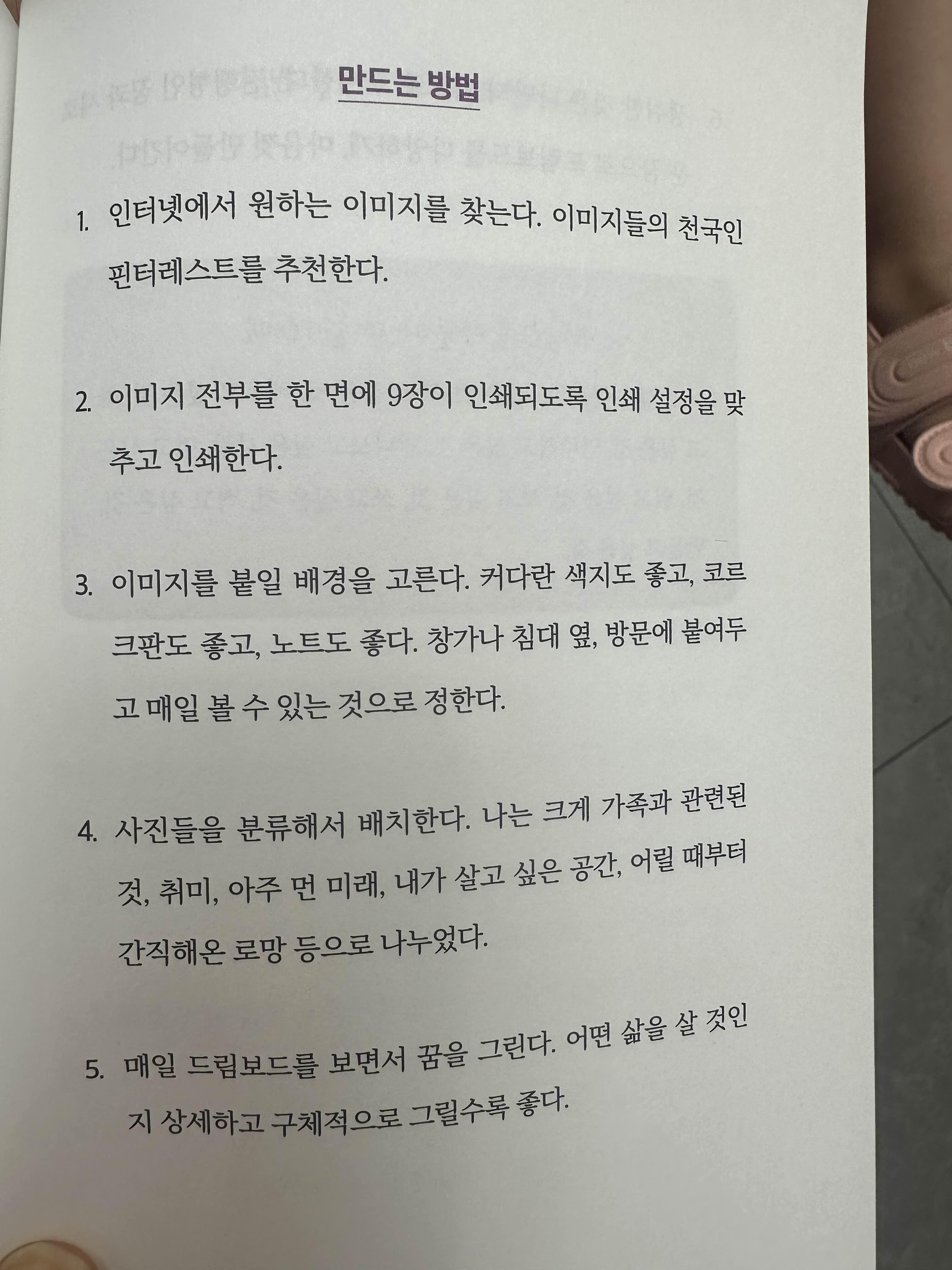 이 부분은 '드림보드 만드는 방법'에 대해 상세하게 설명하고 있어 인상적입니다. 드림보드는 우리의 꿈과 목표를 시각화하는 효과적인 도구로, 그림이나 사진을 활용하여 자신이 향하고 싶은 방향을 명확히 보여주는 방식입니다.