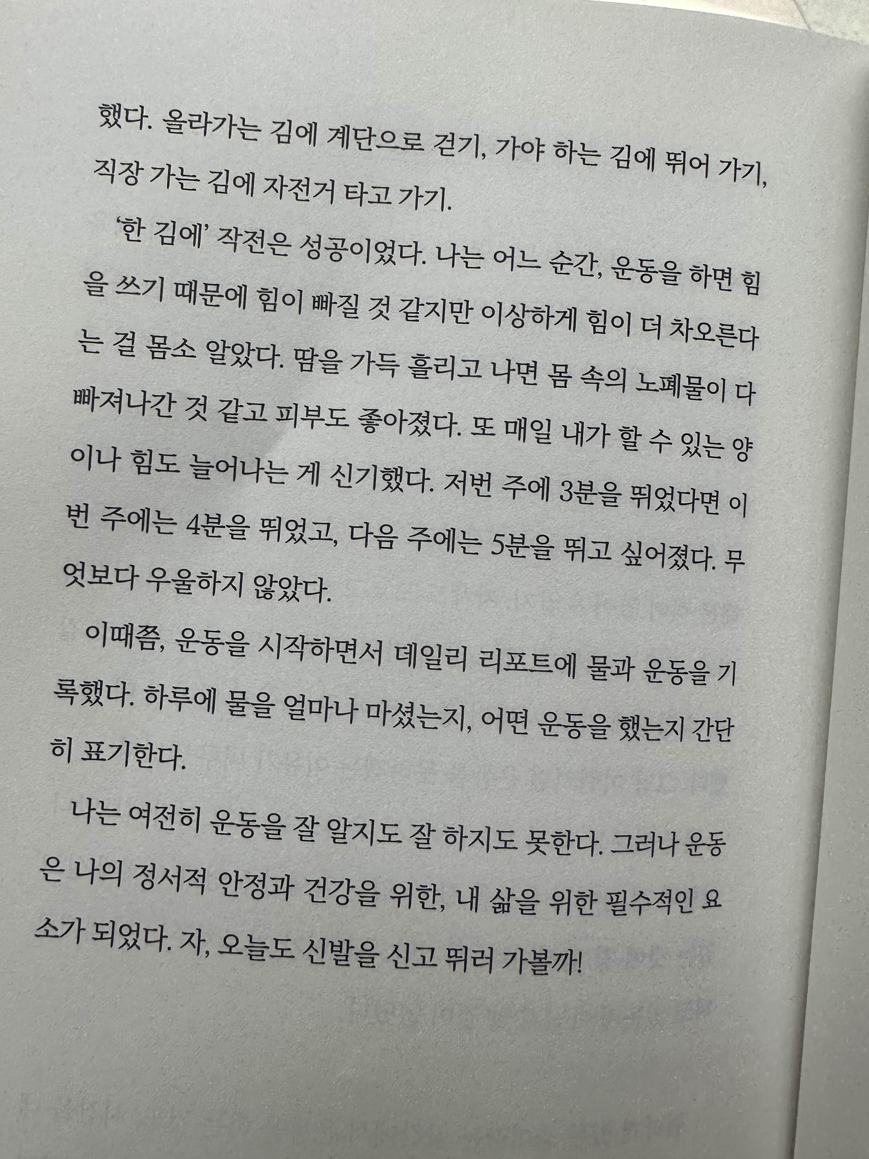 이 부분에서 서혜윤 작가는 운동을 통해 얻는 긍정적인 변화와 성취감을 이야기하고 있습니다. 운동이 몸뿐만 아니라 마음의 건강에도 중요하다는 것에 저도 크게 공감합니다. 또한 운동은 생활 속에서 자연스럽게 통합될 수 있어야 하며, 이 부분에서는 계단을 이용하거나 자전거를 타는 것처럼 일상 생활에서 쉽게 운동을 포함하는 방법을 제시하고 있습니다.