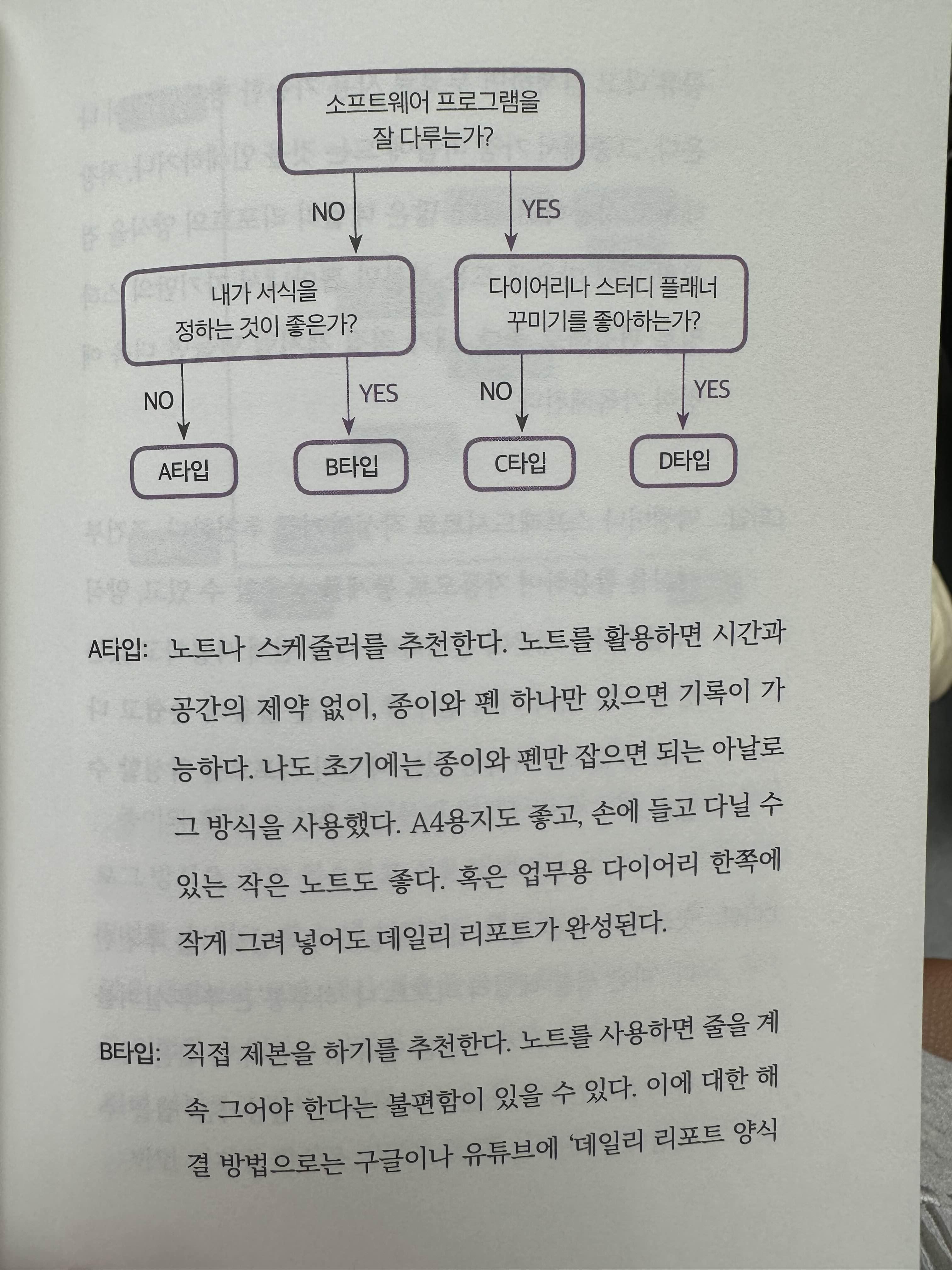 이 부분에서 인상적이었던 것은 '데일리 리포트'가 우리의 머릿속에서 끊임없이 회전하는 '해야 할 일'에 대한 고민을 해결하는 도구가 될 수 있다는 점입니다. 일을 계획하고 그 시간을 명확하게 설정함으로써, 일을 계속 생각하며 불필요하게 걱정하거나 긴장하는 것을 방지할 수 있습니다.