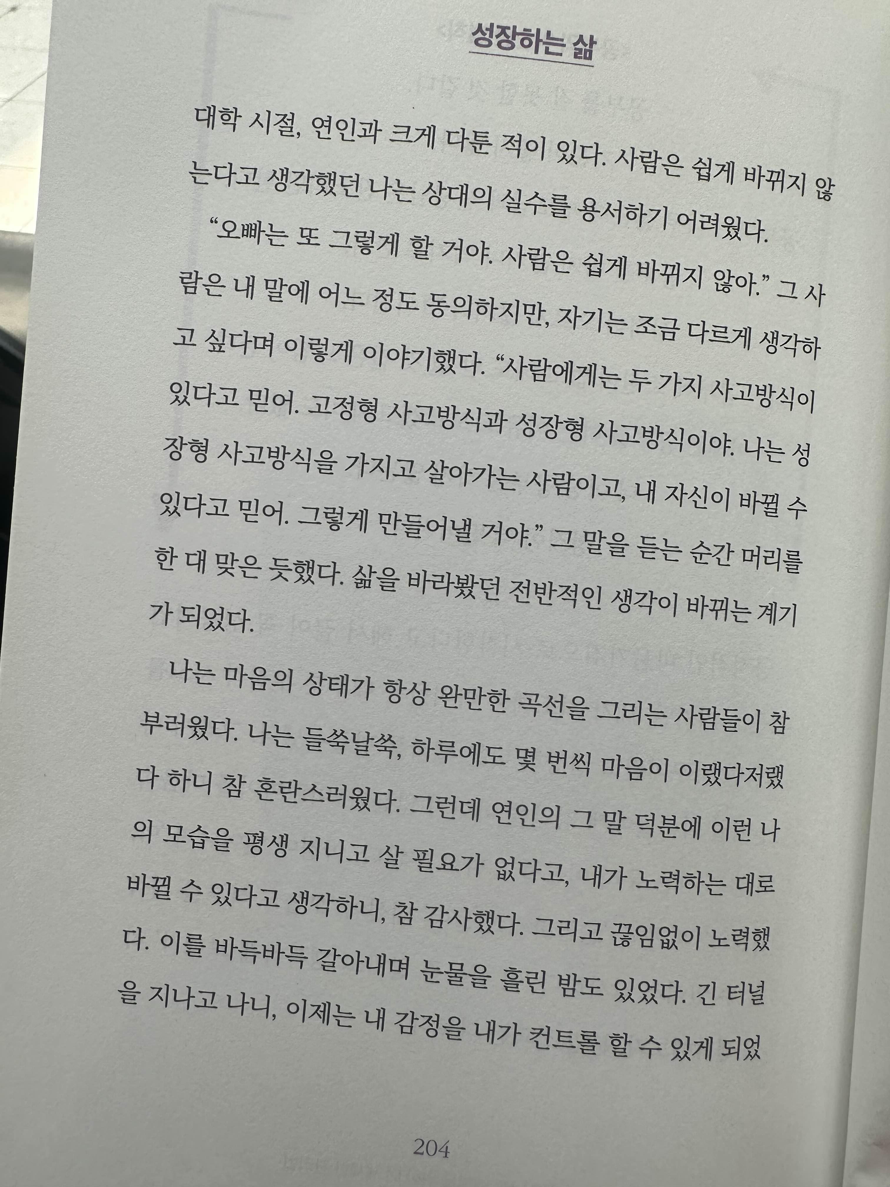그러나 사람은 시간과 노력을 통해 변화하고 성장할 수 있습니다. 이 '성장형 사고방식'은 자기 계발의 중요성을 깨닫게 해주며, 개인적인 도전을 겁내지 않게 해줍니다.
