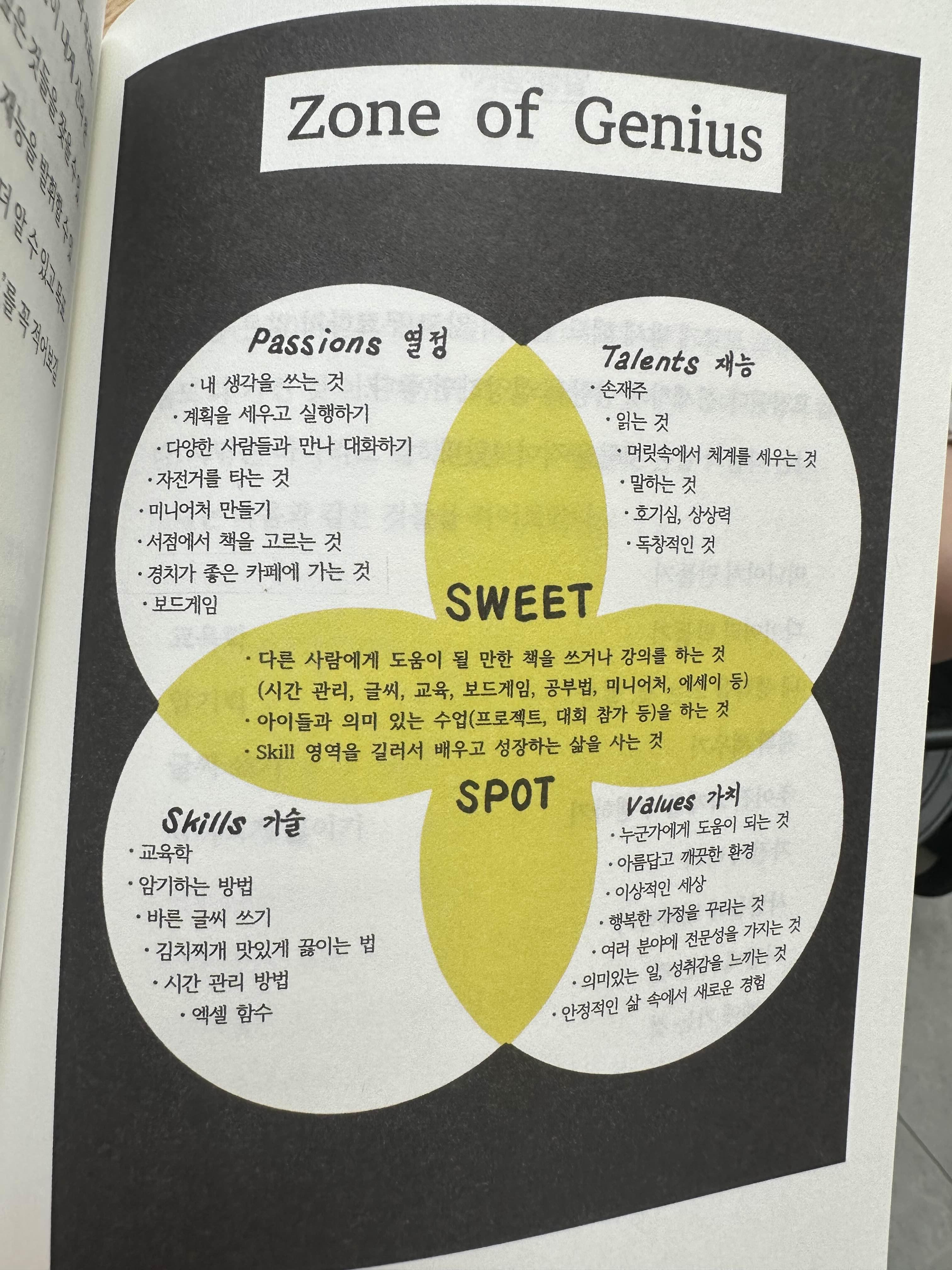 "Zone of Genius" 섹션에서는 개인의 열정, 재능, 기술, 가치를 규명하고, 이들을 바탕으로 자신만의 'SWEET SPOT'을 찾는 방법을 제시하고 있어 인상적입니다. 이는 개인의 기존 능력과 취향을 중심으로 생활과 업무에 활용할 수 있는 방안을 제공하는 아주 독특하고 실용적인 접근법입니다.
