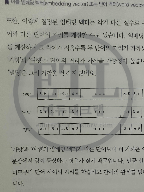 이렇게 결정된 임베딩 벡터는 각기 다른 실수로 구성되어 있어, 한 다 어와 다른 단어의 거리를 계산할 수도 있습니다. 임베딩 벡터의 실숫값의 차 를 계산하여 그 차이가 적을수록 두 단어의 거리가 가까운 식이죠.