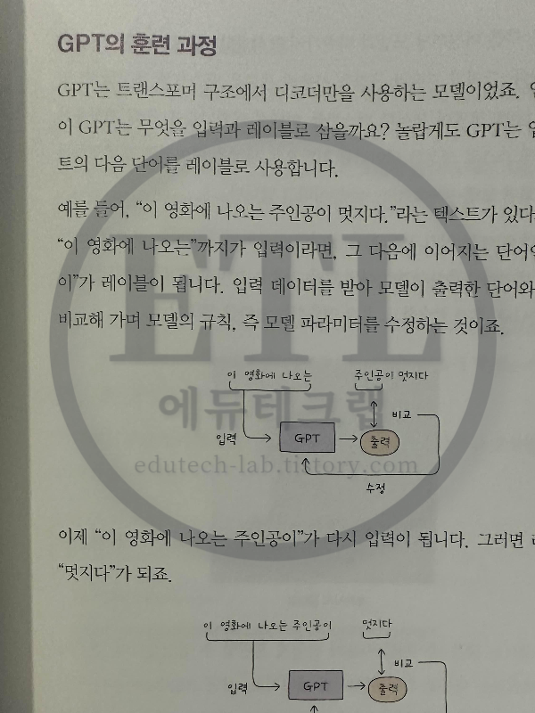 이를 자기 지도 학습(self-supervised learning)이라고 부르며, 레이블을 일일이 매기지 않아도 되므로 효율적인 방식이라고 설명하고 있습니다. 이러한 방식을 통해 GPT는 텍스트의 패턴을 학습하고 생성하는 능력을 갖추게 됩니다.