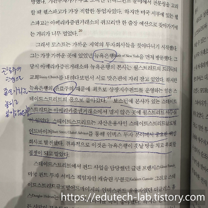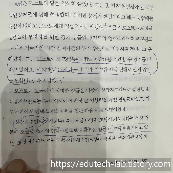 여기서 보글과 모스트 사이의 대화를 중심으로 상장지수펀드, 즉 ETF 탄생과 그 영향을 다룬 부분이었습니다.