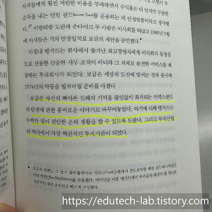 보글은 자신의 과거 실패를 그냥 지나치지 않았습니다. 그는 그 실패에서 인덱스펀드라는 혁신적인 아이디어의 탄생을 보여주며, 그것이 어떻게 투자산업에 큰 변화를 가져왔는지를 선명하게 그려냅니다.