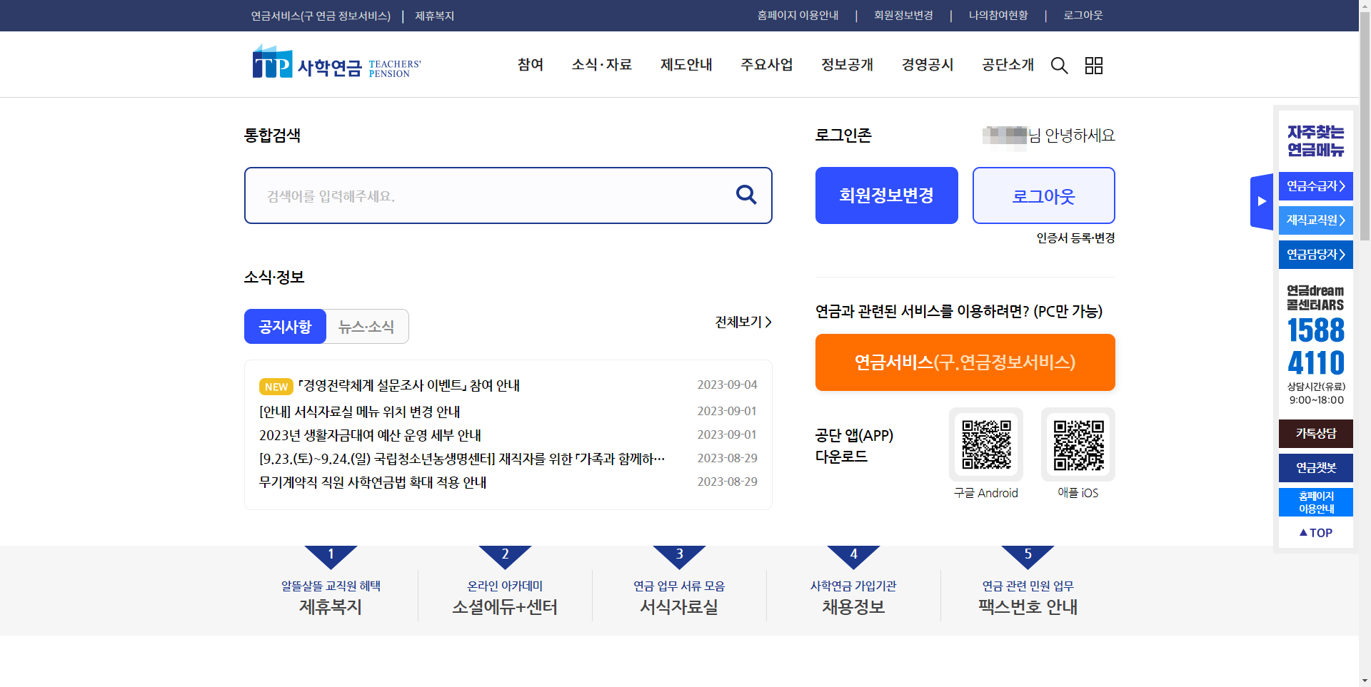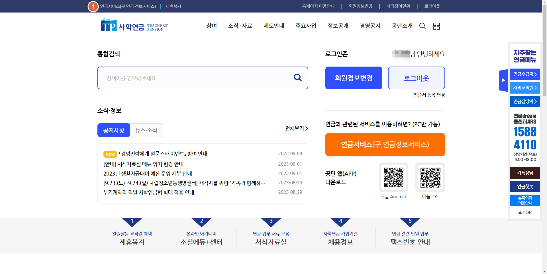 연금 서비스에 들어오시면 사학연금 좌측 메뉴에 보시면 전체메뉴가 있습니다.