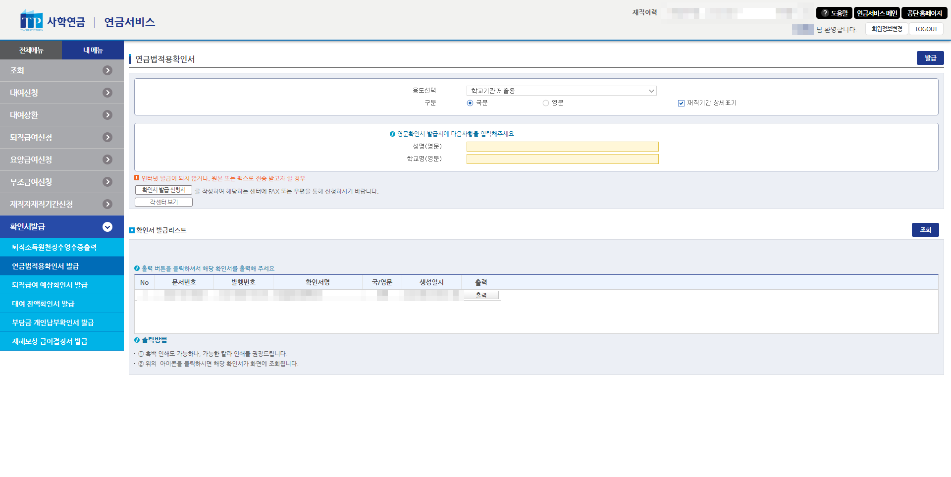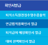 전체메뉴에서 확인서 발급을 클릭하고 연금법 적용 확인서 발급을 누르면 발급이 가능합니다.