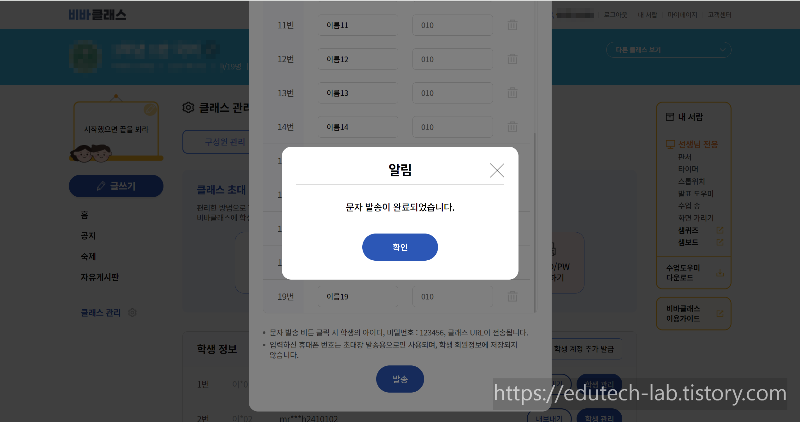 "로그인 후 OOO학교 O학년 O반 과목으로 들어오세요"라는 메시지도 포함하여 자동 문자 발송되므로 정말 좋습니다.
