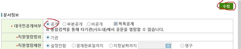 3️⃣대국민공개여부를 공개로 클릭하고 수정을 누르면 비공개에서 공개문서로 변경이 완료됩니다.