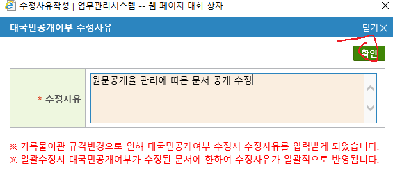 6️⃣수정사유작성 후 확인을 누릅니다.