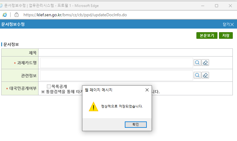 ▶정상적으로 저장되었습니다는 안내창과 함께 문서공개가 비공개에서 부분공개로 변경완료됩니다.