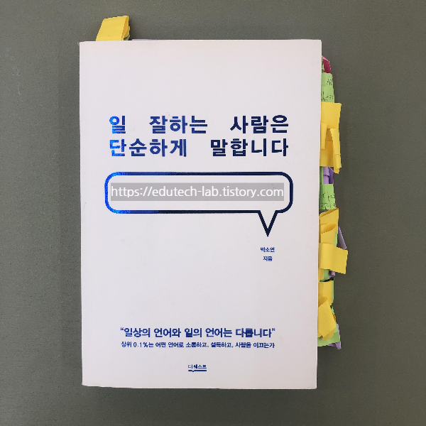 제가 아끼는 책이기도 한 일 잘하는 사람은 단순하게 말합니다입니다. 아래 사진을 보시면 제가 읽으면서 인상 깊었던 부분을 붙여놓은 포스트잇이 보이실 것입니다.