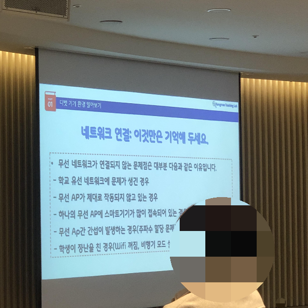 일선 학교에서 네트워크연결은 학교유선네트워크 문제 혹은 무선 ap가 제대로 작동되지 않거나 하나의 무선 ap에 스마트기기가 많이 접속되어 있는 경우, 무선 ap간 간섭이 발생하는 경우, 기기 와이파이꺼짐, 비행기모드 실행과 같은 기본적인 설정 문제도 있다고 합니다.