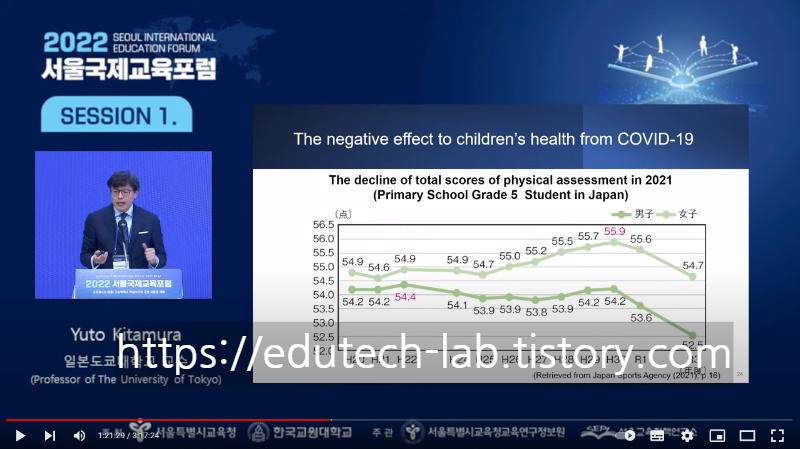기타무라 유토 교수는 코로나19로 인해 온라인 학습이 시작되면서 가정의 경제 상황에 따른 교육격차가 심화되었다고 하였습니다. 이를 해결하기 위해 스마트기기를 활용한 학교 교육 혁신이 이루어져야 한다고 주장했는데요. 특히 AI와 빅데이터를 활용한 개인별 맞춤형 학습이 학생의 배움에 필수적이라고 강하게 말했습니다. 더불어 디지털 기기 활용 능력 역시 기초학력의 범위 안에 들어가야 한다고 했습니다.