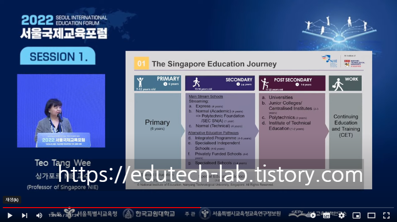 테오 탱 위 교수는 모든 학생을 한 가지 방법으로 교육하는 것이 효율적인 것으로 보이나 꼭 그만큼 효과적 이지는 않다고 지적하였습니다. 교육제도는 개개인의 차별화된 학습 요구와 성취도를 반영해야 한다고 주장하며 학생들에게 학습 과정에서 선택지를 줄 것을 제안하였습니다. 싱가포르는 6년간의 초등교육을 마치면 국가시험인 초등 졸업시험을 치르고 이 결과를 바탕으로 중등학교에 진학합니다. 학생들은 자신의 적성과 흥미를 고려하여 일반적으로 진학하는 주류 학교와 현장 및 실무 학습, 스포츠, 예술, 과학, 수학 등에 특화된 특성화 학교 중에서 선택할 수 있다고 합니다.