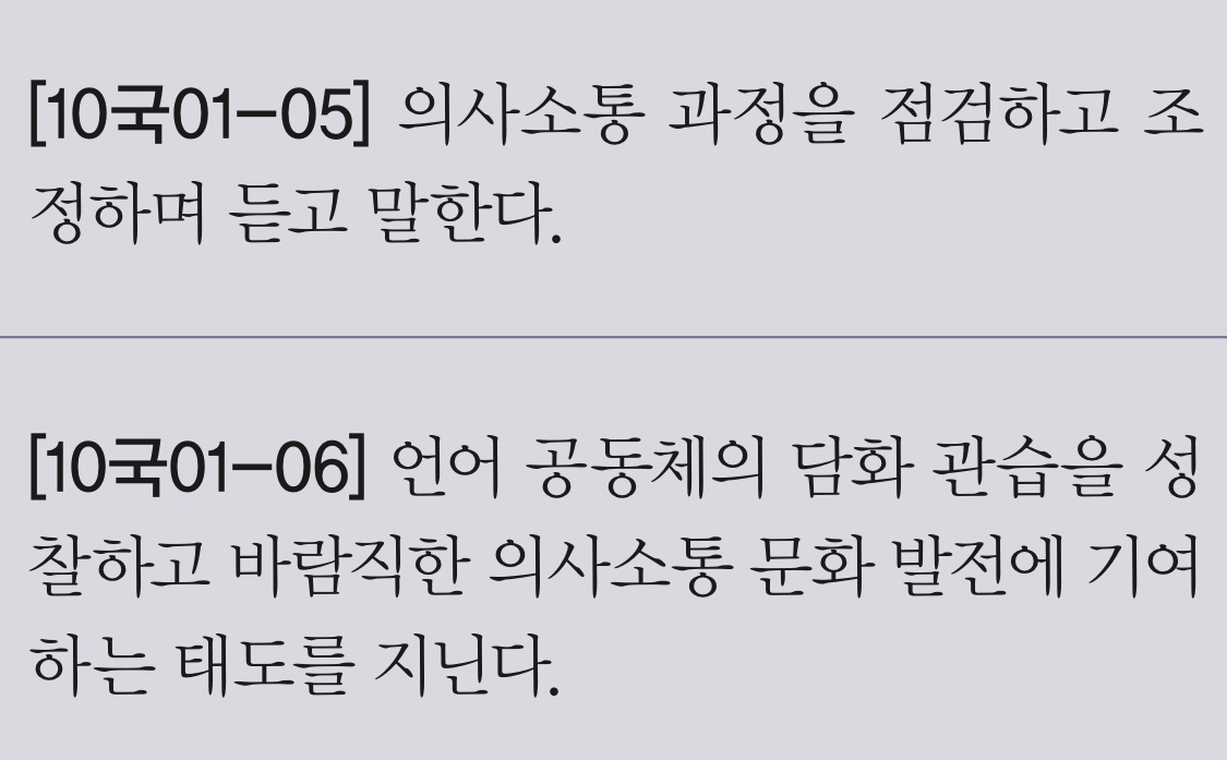 - [10국01-06] 언어 공동체의 담화 관습을 성찰하고 바람직한 의사소통 문화 발전에 기여하는 태도를 지닌다.