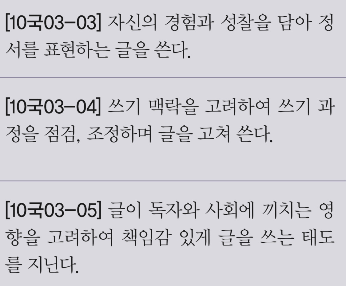 - [ 10국03-05] 글이 독자와 사회에 끼치는 영향을 고려하여 책임감 있게 글을 쓰는 태도를 지닌다.