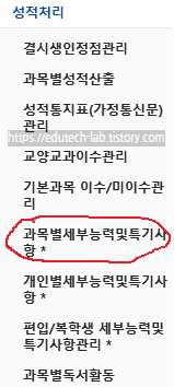 나이스 - 성적- 성적처리에서 과목별세부능력및특기사항*을 클릭합니다.