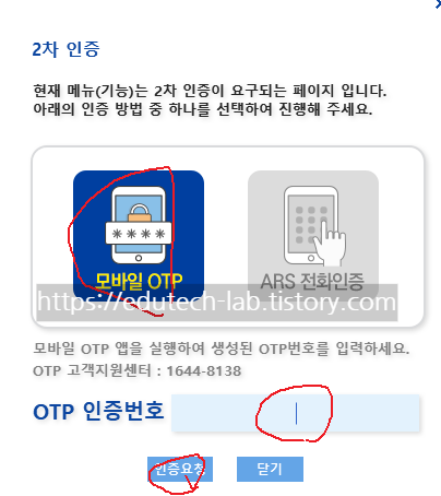2차인증을 통해 휴대폰 모바일 OTP에서 OTP인증번호를 받아 입력 후에 인증요청을 누릅니다.