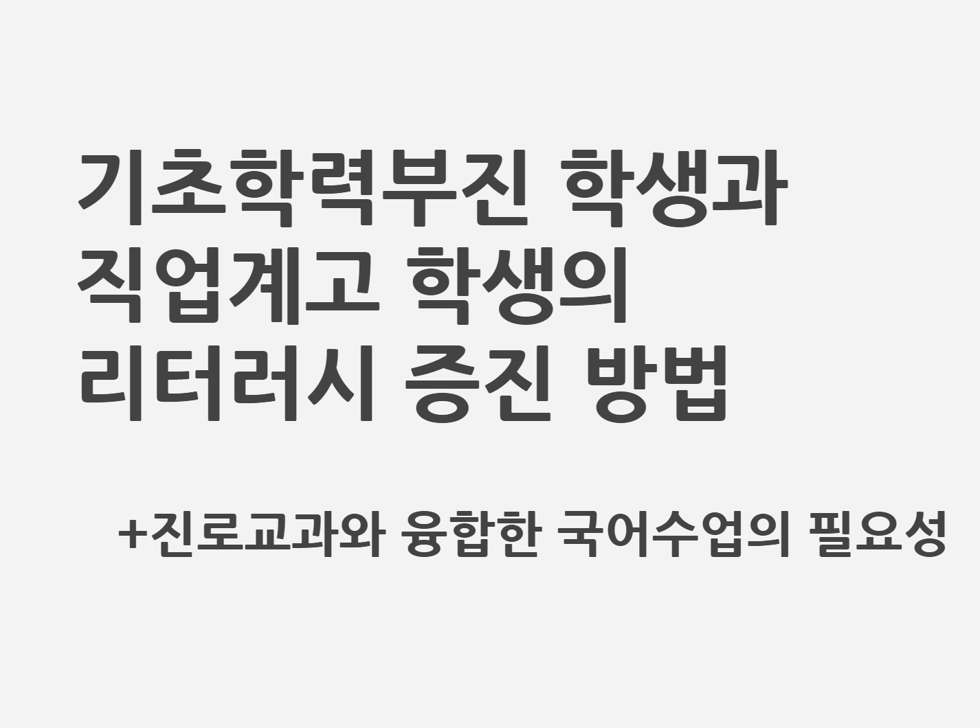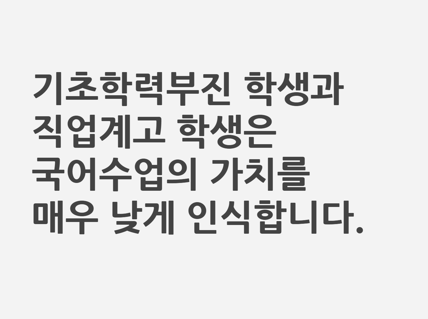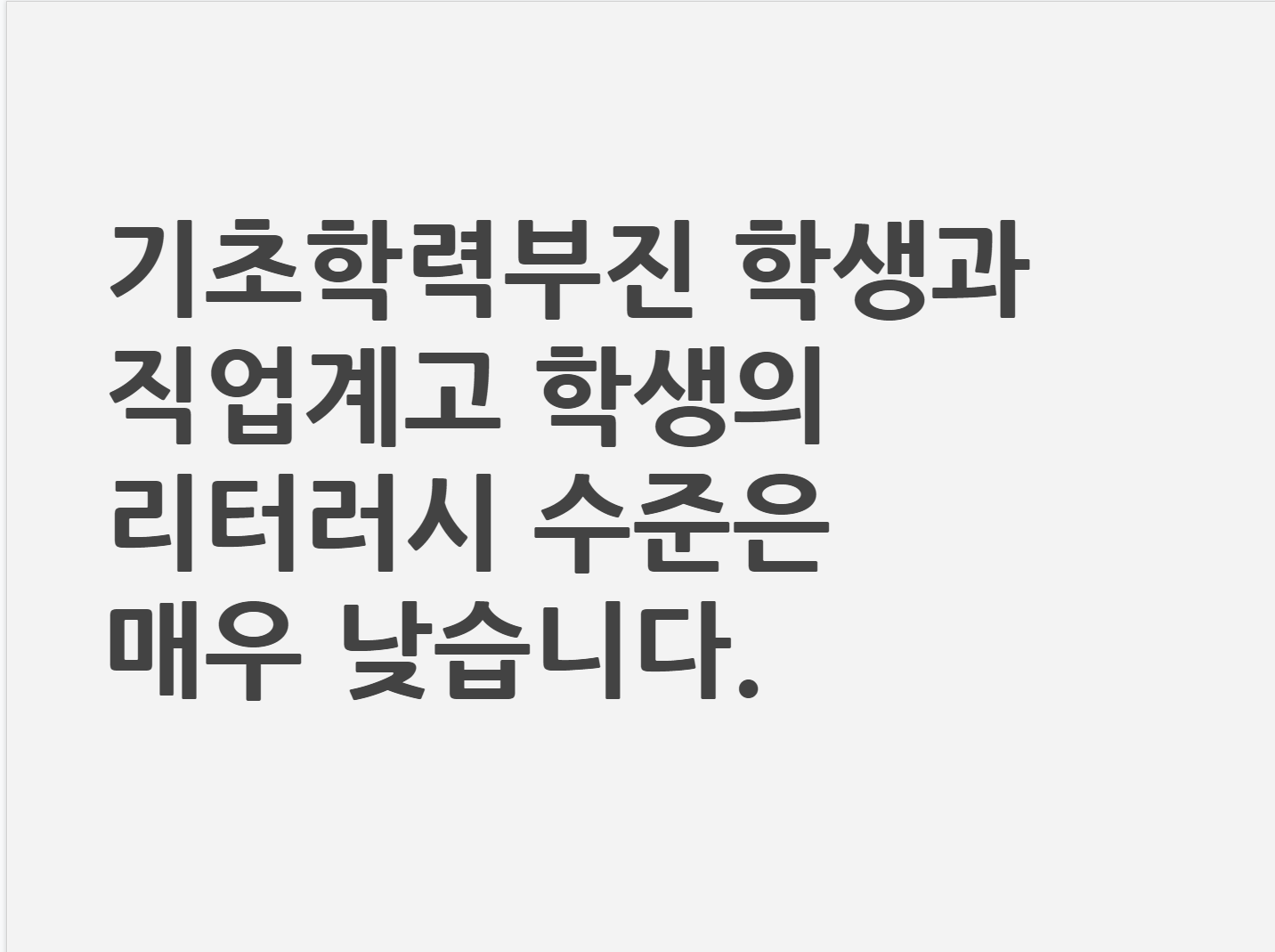 이러한 연구결과를 요약하면 기초학력 부진 학생은 국어 수업을 자신의 진로와는 아무런 관련이 없다고 인식한다는 것을 알 수 있습니다. 또한 직업계고(특성화고, 마이스터고 등) 학생들 역시 자신의 진로 설계와 국어 수업은 관련이 없다고 생각합니다. 결국 기초학력부진 학생과 직업계고 학생들 모두 국어 수업에 대한 흥미가 낮고, 참여도 역시 낮습니다. 자연스럽게 국어 수업에서 키울 수 있는 리터러시 역량에 소홀해집니다. 이는 기초학력부진 학생과 직업계고 학생의 리터러시 역량이 지속적으로 감소하는 악순환을 반복하게 합니다.