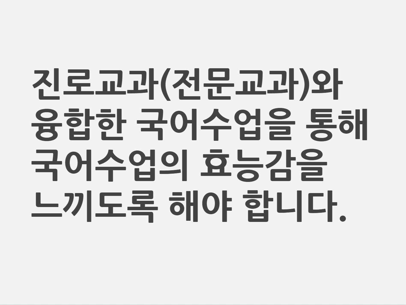 이러한 수업을 가장 직접적으로 설계할 수 있는 방법은 바로 진로교과와 융합한 국어 수업입니다. 학생이 국어 수업을 통해서 자신의 진로를 탐구하고 설계한다면 국어 수업의 효능감도 느끼고, 리터러시 역량도 키울 수 있습니다. 국어 교사는 진로교과 교사 혹은 전문교과 교사와 협업하여 프로젝트를 설계하는 노력을 해야 합니다.