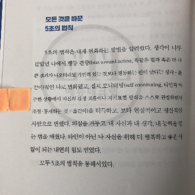 5초의 법칙은 변화하는 방법을 알려줍니다. 생각이 너무 많았던 나에서 행동 편향적으로 변화하게 만들어 주고, 셀프 모니터을 터득하게 합니다.
