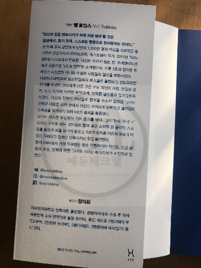 이 책의 저자 멜 로빈스는 라이프코치입니다. 41살에 부도직전의 위기를 겪고있는 남편의 사업, 그로인해 발생한 끔찍한 부부관계, 그리고 소위 말하는 경단녀, 즉 로스쿨을 졸업하고 결혼과 육아로 인해 경력이 단절된 상태로 절망과 허무, 실의에 빠져 살았습니다.