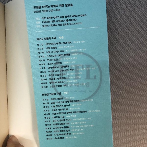 특히 퇴근길 인문학 수업 전환은 지금과는 다른 시선으로 나를 돌아보기라는 부제에 걸맞게 내용을 구성하고 있는데요. 역사를 비롯하여 문화, 심리, 동양고전, 건강, 미술, 지리, 천문에 이르기까지 인문학의 전분야에 걸쳐서 흥미로운 주제를 선정하였습니다.