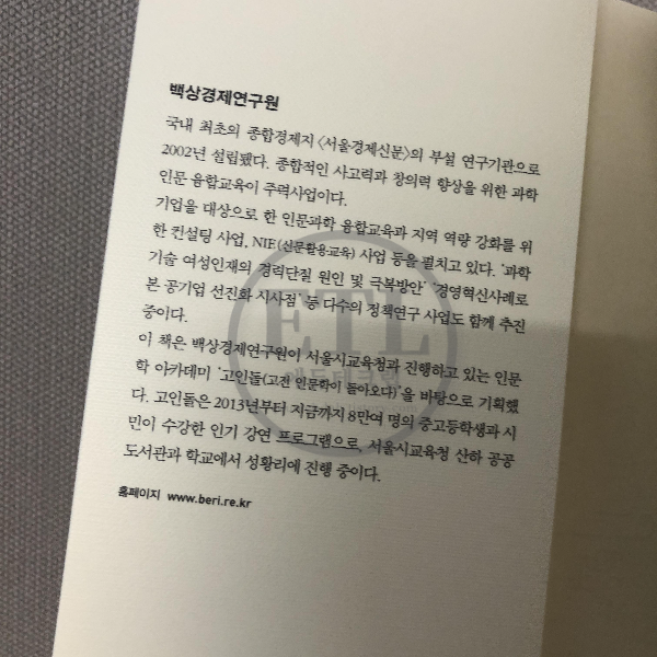 앞에서 언급한 것처럼 백상경제연구원은 서울경제신문이 부설 연구기관으로 2002년에 설립되었는데요. 기업을 대상으로 지속적으로 인문과학융합교육을 실시해왔기에, 퇴근길 인문학 수업 전환은 직장인들의 인문학 습득에 딱인 책이라고 할 수 있습니다.