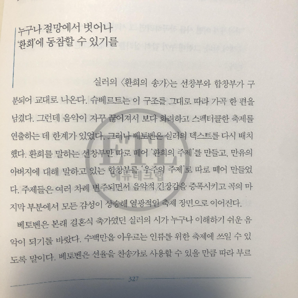 순수하게 음악만으로 작곡되어야 한다는 교향곡의 전통을 뒤집어 베토벤이 실러의 가사를 전격 도입한 것은 더 많은 사람들과 공감하고 소통하려는 의지에서 비롯되었다. -퇴근길 인문학 수업 전환 중에서
