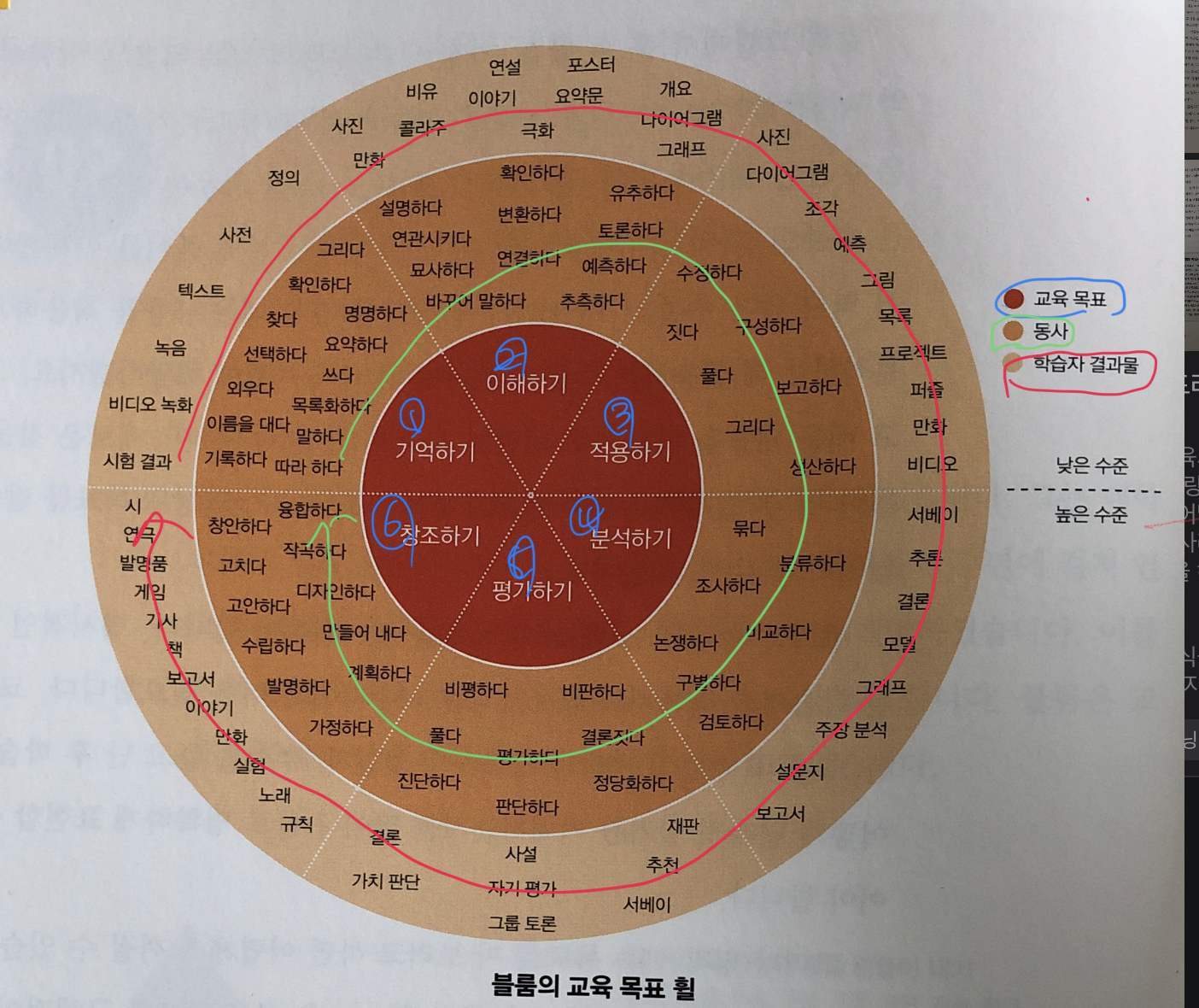 다음으로 블룸의 교육목표 휠입니다. 혼합수업을 위한 학습목표를 설계할 때 큰 도움이 됩니다.