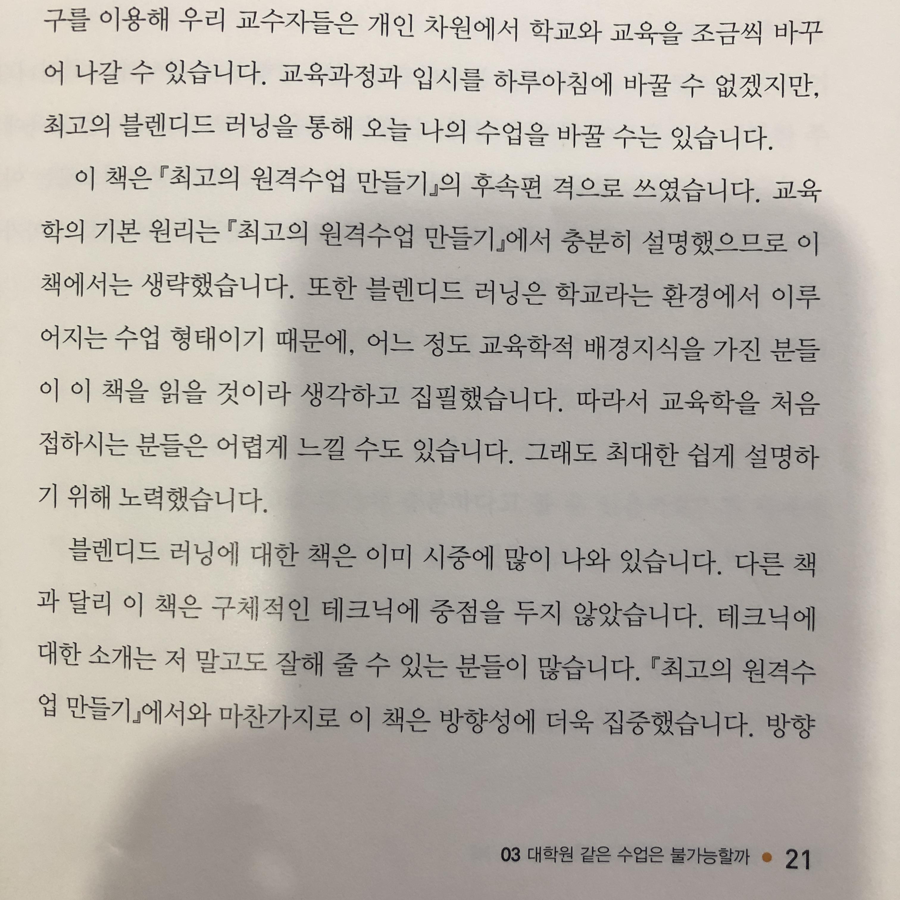 최고의 블렌디드 러닝은 코로나 팬데믹을 넘어, 이제 원격수업에서 교실 수업으로 넘어오는 시점과 맞물리면서 새로운 수업 혁신을 준비하는 저에게는 찰떡과 같은 책이었습니다.