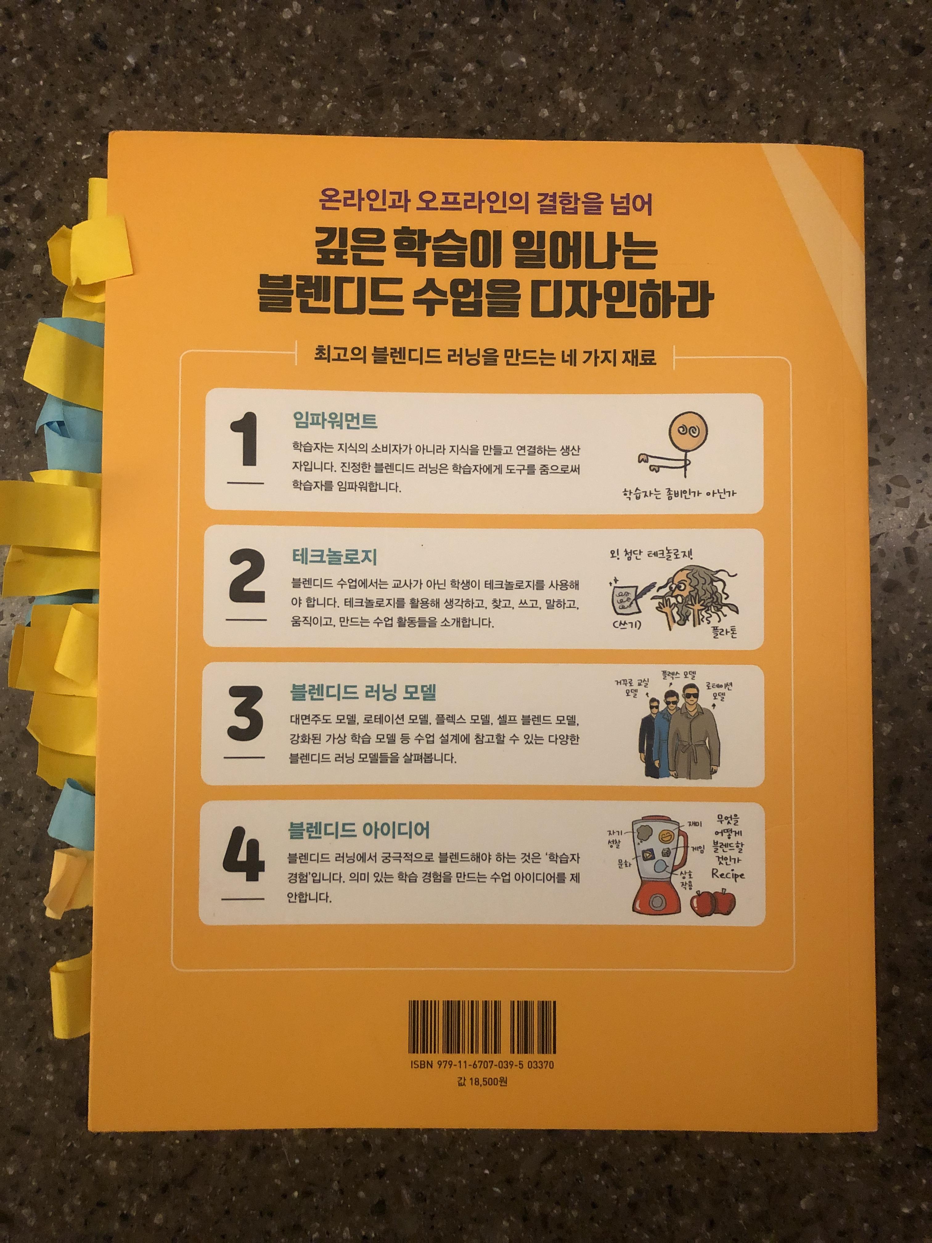 제가 찍은 최고의 블렌디드 러닝을 보시면 수없이 많이 자주 반복해서 보고 인상 깊은 구절은 포스트잇을 덕지덕지 붙였습니다. 얼마나 제가 아껴서 애지중지해서 보았는지 알 수 있습니다.