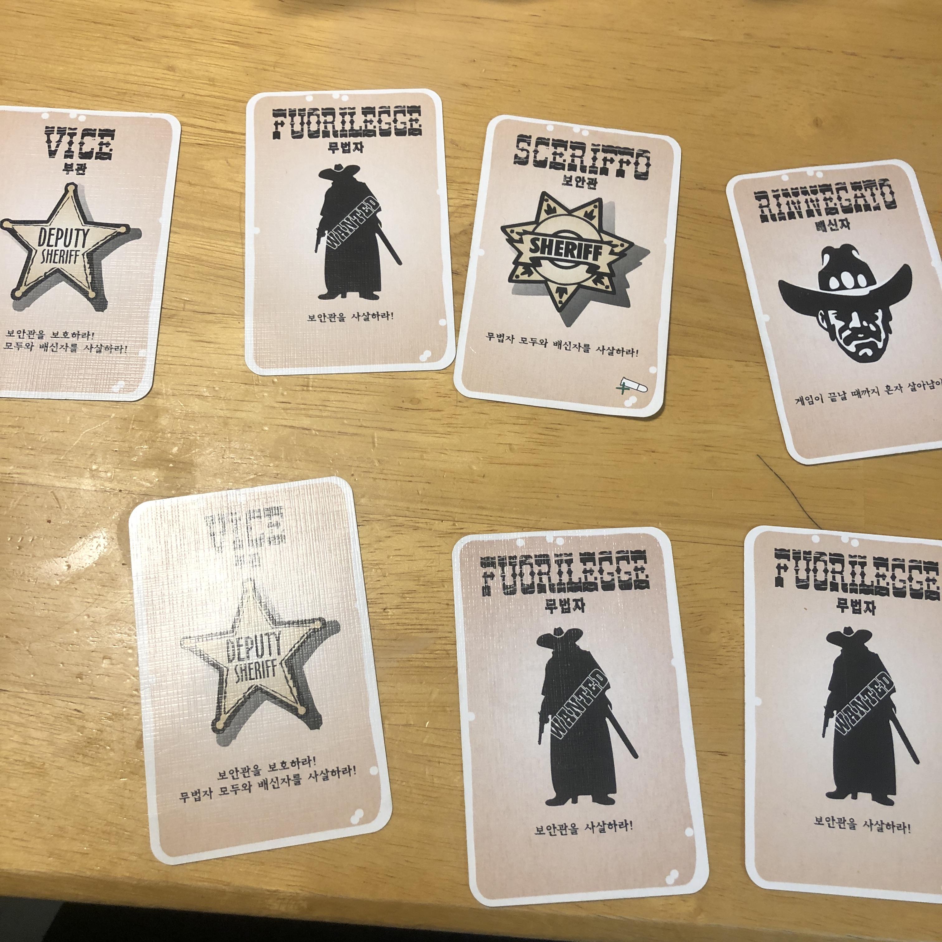 보드게임 뱅은 위의 역할카드를 뽑게 되는데요. 보안관, 부관, 무법자, 배신자라는 역할을 부여합니다.