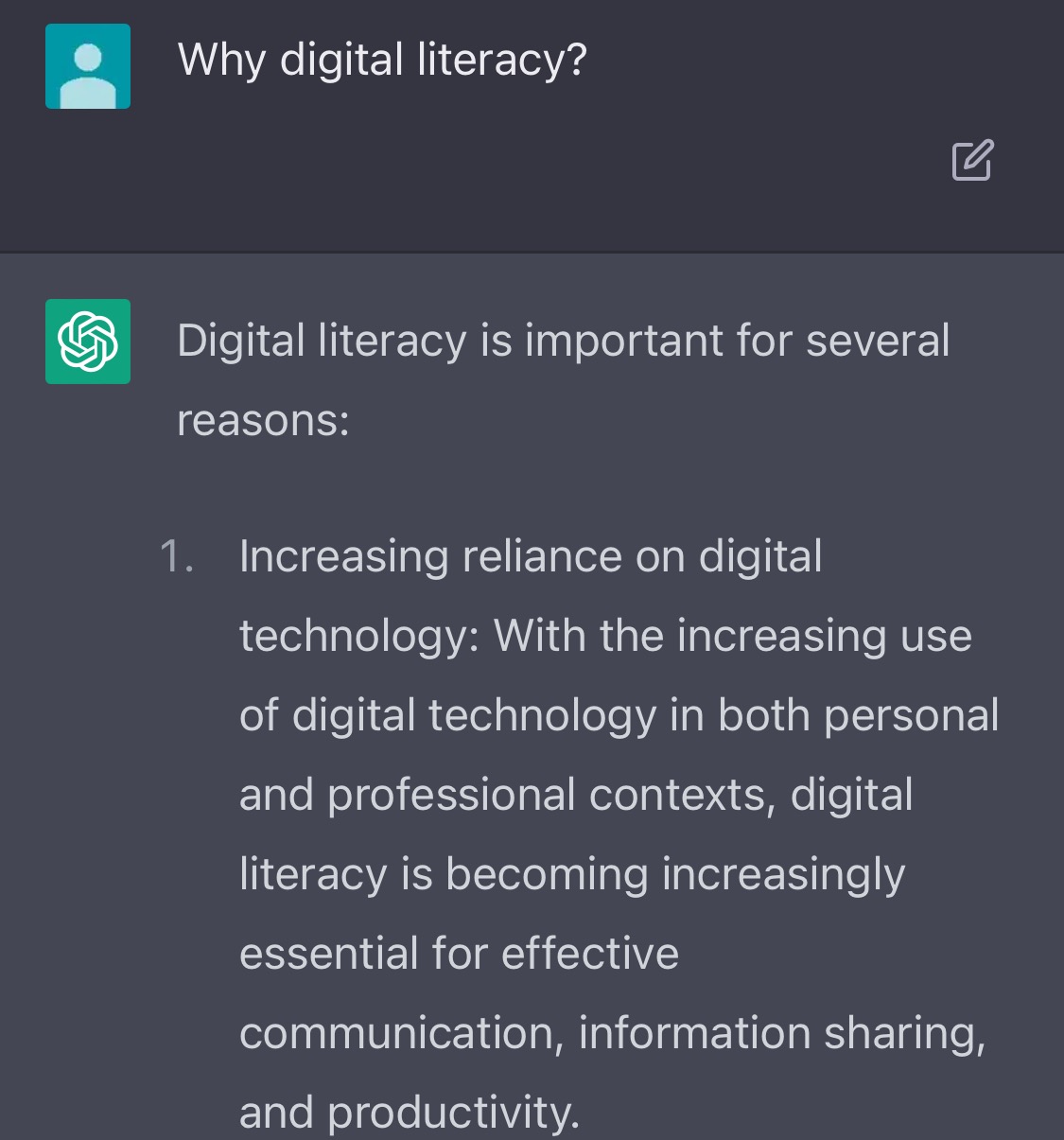 Increasing reliance on digital technology: With the increasing use of digital technology in both personal and professional contexts, digital literacy is becoming increasingly essential for effective communication, information sharing, and productivity.