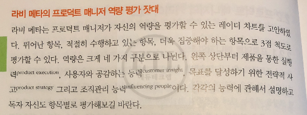 먼저 아무래도 제가 잘 알지 못하고 추상적으로 이해하고 있으며 가장 알고 싶었던 것이 바로 프로덕트 매니저라는 직무였습니다. 이에 저자는 프로덕트 매니저의 업무 범위를 설명하기 위해 마티 케이건이 그린 벤다이어그램과 라비 메타의 프로덕트 매니저 역량 평가 잣대가 소개되어 있습니다.