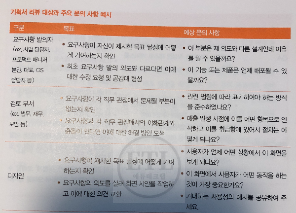 프로덕트 매니저에게 기획서가 얼마나 중요한지를 알 수 있게 하고 더불어서 위의 표에서처럼 구체적인 업무 담당자에게 무엇을 어떻게 질문하고 확인해야 하는지 그리고 왜 그러한 리뷰를 해야 하는지 명확하게 다루고 있습니다.