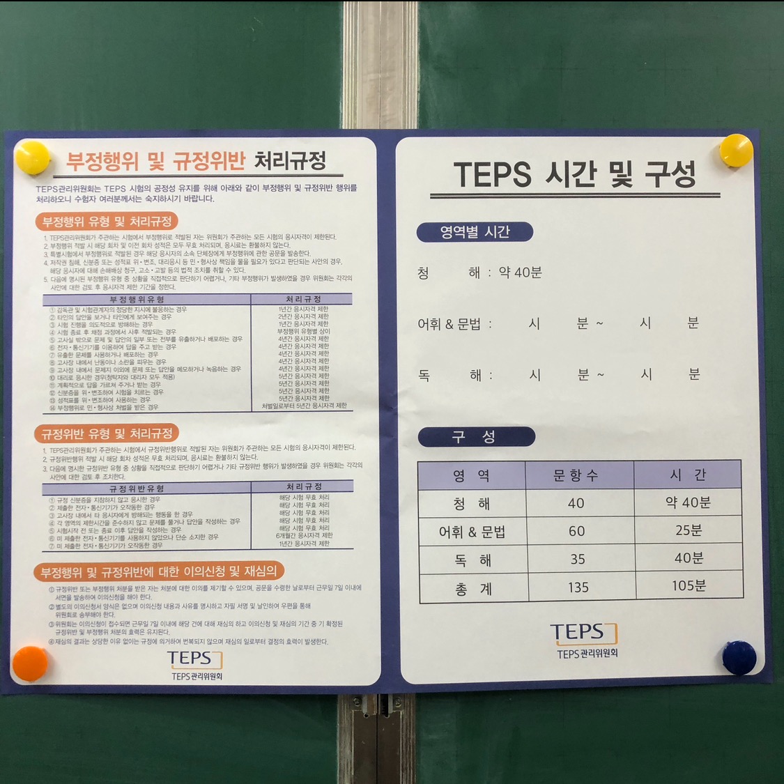 TEPS수험번호와 생년월일은 수험표에서 확인 가능하니 수험표 미리 출력해서 갖고 가시구요. 좌석번호(A1~E5)와 고사장실 번호는 고사장 입구 앞에서 확인가능하니 미리 확인하고 수험표에 적어두면 편합니다. 실제로 이거 확인하려고 답안지 배부후에도 수험생들이 자리를 이탈하는 어수선함이 펼쳐졌습니다.